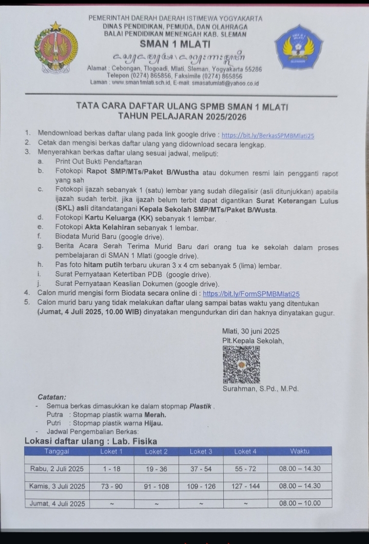 Kami sampaikan Tata cara Daftar Ulang SPMB SMAN 1 Mlati Tahun Pelajaran 2025/2026